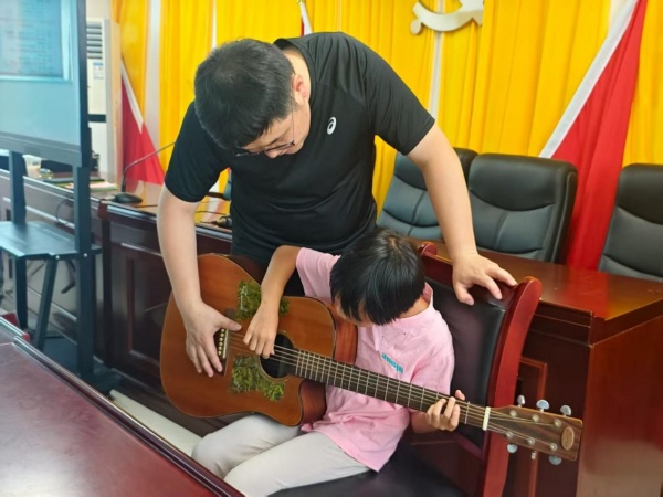 第三天,队员吴丹从“最喜欢的乐器”切入,为小朋友们介绍了吉他的琴身构造、持琴姿势、基本指法,手把手教授孩子们拨弦……当孩子们指尖终于弹出清脆的单音,那一声“叮”仿佛种子破土,发出对世界的第一次问候。“原来吉他也会讲故事!”一个小女孩抱起琴,笑得比弦音还亮。