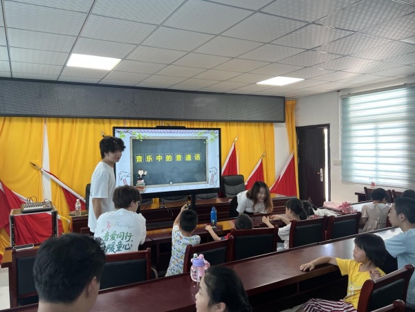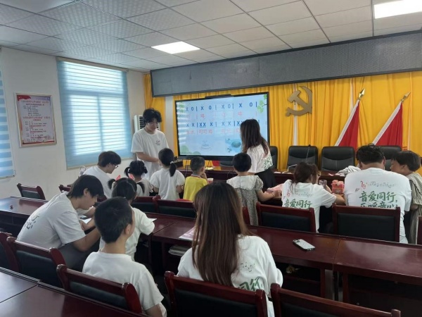 活动首日,“音乐中的普通话”在村委会会议室开讲。队员们精选歌曲《小美好》,将歌词逐字标注拼音,带领孩子们朗读、跟唱。“前鼻音、后鼻音”被旋律轻轻揉碎,融进童声,化作山村里最动听的注音符号。击鼓传花、词语接龙、绕口令……游戏串成的笑声,把语言的沟壑填成平原。