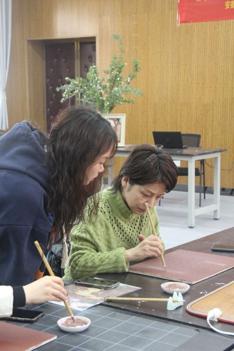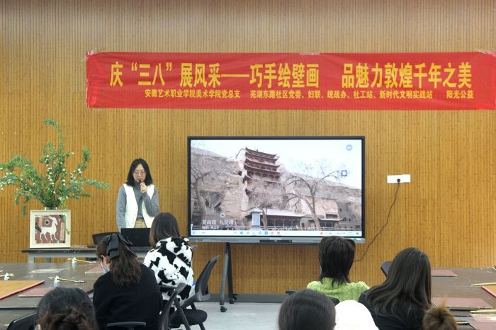 3月3日下午,由美术学院中国传统书画装裱与修复工作室的教师孙童,带领该工作室志愿者同学们,在安徽艺术职业学院美术学院学术报告厅为党建联盟的妇女职工开展了敦煌文化讲座与壁画体验活动。