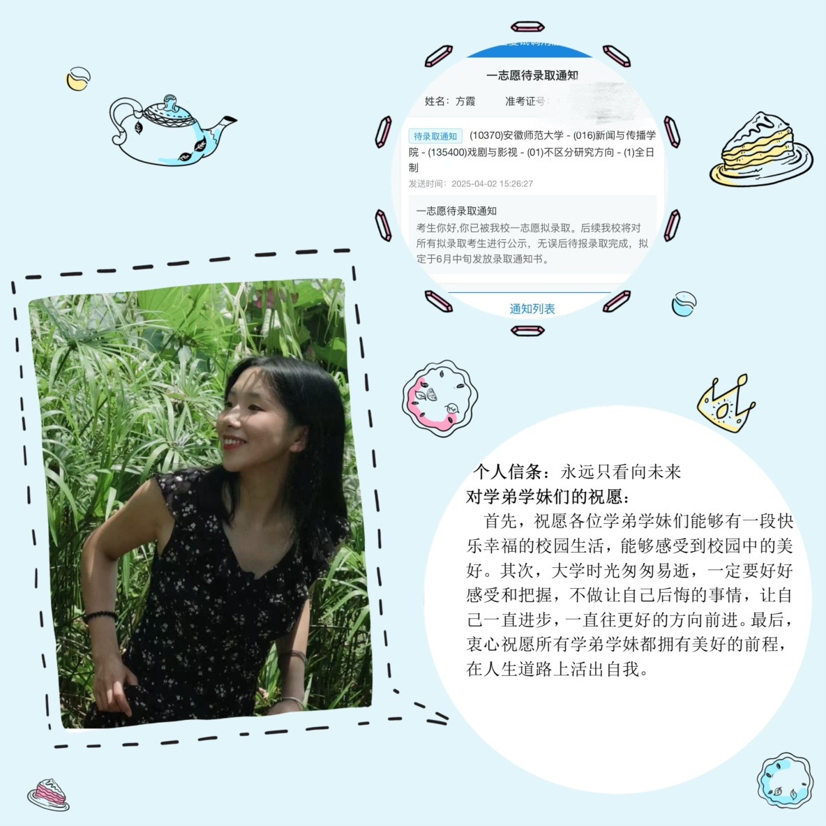 方霞同学在综合艺术学院学习期间,始终保持着对表演艺术的热爱和追求,专业成绩优异。她积极参与各类实践活动,不断提升自己的综合素质和专业能力。在决定考研后,方霞同学制定了详细的学习计划,克服了重重困难,不负青春、不负韶华,成功“上岸”。 “备考期间,我迷茫过、挣扎过、焦虑过,但是还是坚持下来了。想要收获果实,必须锲而不舍地付出努力。”方霞说道,“还要感谢老师同学们给我鼓励,保持好心态才能在备考中沉下心来认真学习。”