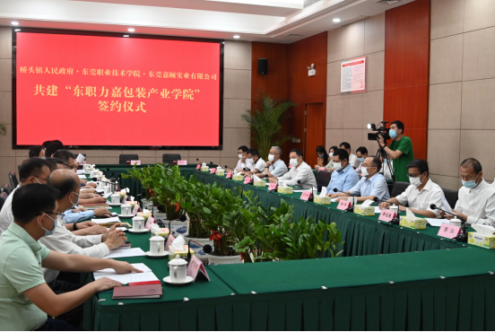 为推动“政校企”深度融合,促进我市包装相关产业高质量发展,4月29日上午,东莞市桥头镇人民政府、东莞职业技术学院、东莞力嘉国际集团三方,共同签约共建“东职力嘉包装产业学院”。桥头镇委副书记、镇长刘锦棠,副镇长陈锐毅、莫镇鹏,东莞职业技术学院党委书记朱益民,党委副书记、校长贺定修,党委委员、副校长杨云奇,力嘉国际集团董事长马伟武,以及桥头镇相关部门、东莞职业技术学院相关院系负责人等参加了签约仪式。