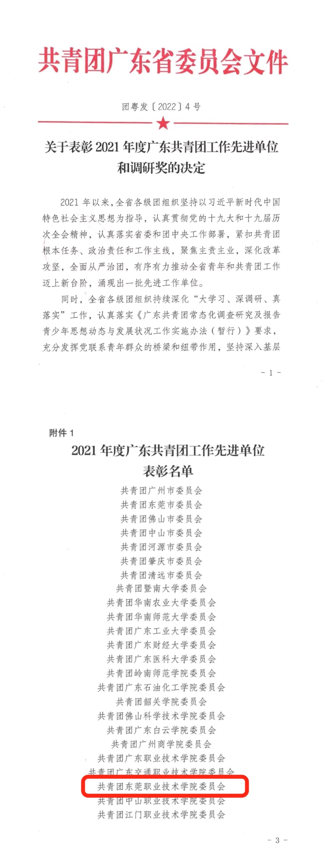 2022年3月3日,共青团广东省第十四届委员会第六次全体(扩大)会议在广州召开。大会表彰了2021年度广东共青团工作先进单位,我校获评“2021年度广东共青团工作先进单位”。