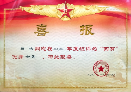 杨浩同学入伍以后牢记学校老师和父母的嘱托,认真学习领会习近平强军思想,勤学军事理论知识,苦练军事技能本领,3000米越野成绩达到11分04秒,20米战术匍匐前进成绩达到16秒,他以此两项科目代表中队参加支队比武,取得优异成绩。新训期间曾因表现突出荣获团嘉奖1次,2021年度因综合表现突出被支队评为有灵魂、有本事、有血性、有品德的“四有优秀士兵”。