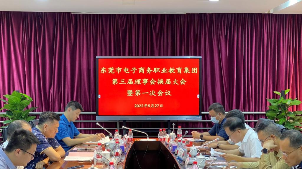 2022年5月27日,东莞市电子商务职业教育集团第三届理事会换届大会暨第一次会议在我校举行。来自东莞职业技术学院、东莞市电子商贸学校、东莞市电子商务联合会、广东名人投资集团、京东集团、东莞市百达连新电子商务有限公司等十余家集团理事代表齐聚一堂,共商职业教育集团在新职教法出台后的发展大计。