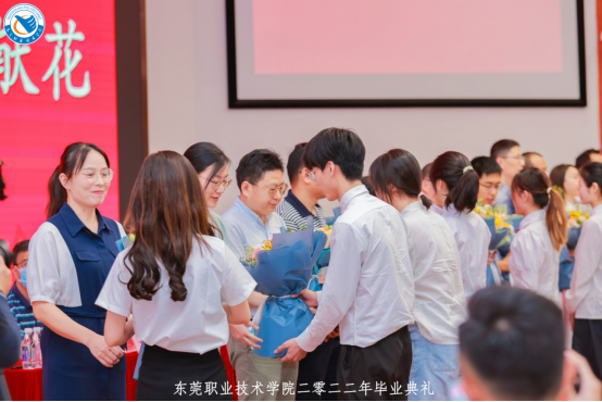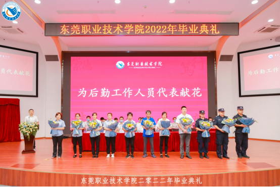 为了更好地感谢恩师、告别母校,毕业生代表还向优秀教师代表、后勤工作人员代表献上鲜花,为他们送上自己最真挚的感谢。