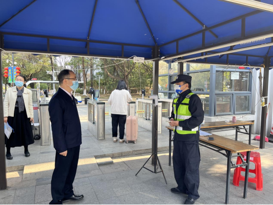 贺定修校长在学校南门详细询问安保人员学生入校流程,查看学生返校扫码、身份验证等工作,并强调保卫处和学生处要协力合作,精准掌握学生返校数据,认真做好人流、车辆疏导工作。