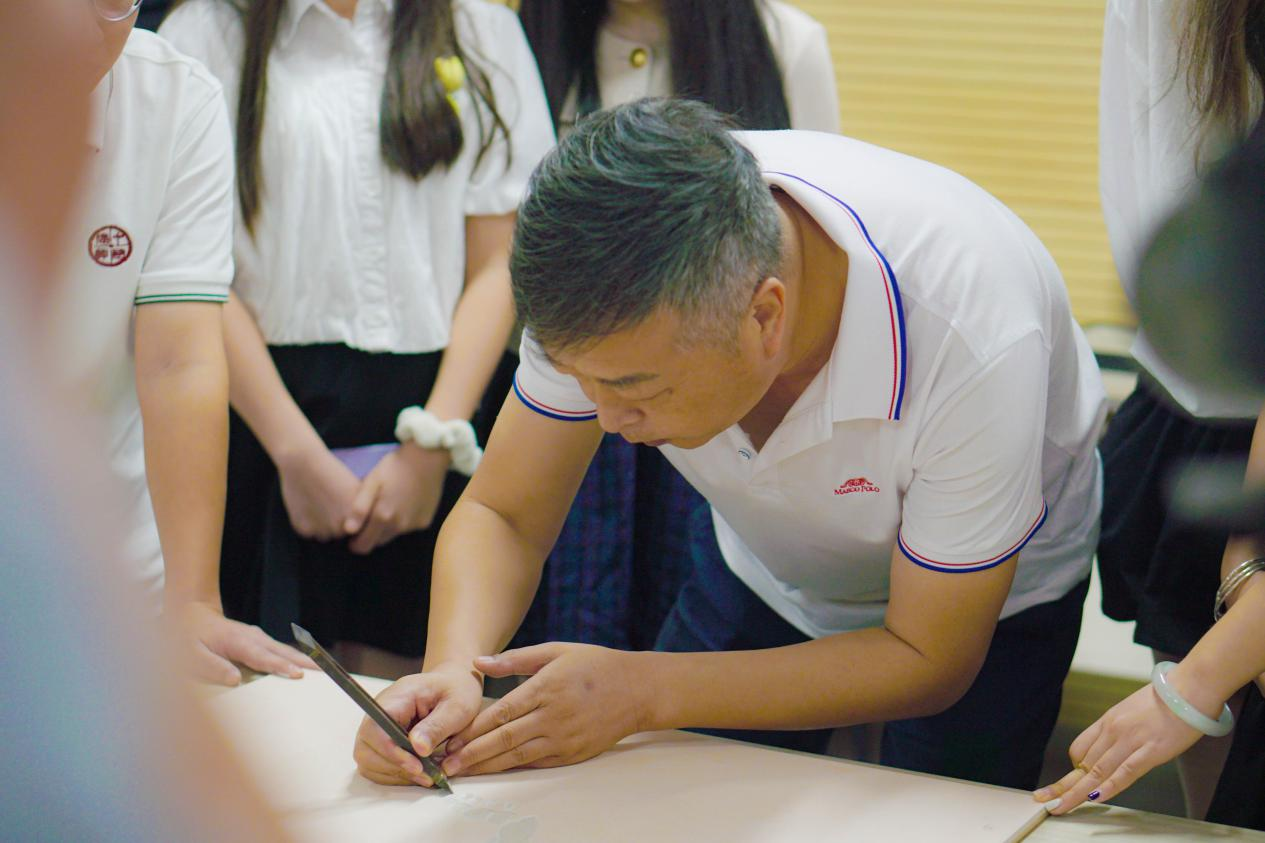 活动现场,杨晓光大师为嘉宾演示瓷板画雕刻绝活并给工作室同学仔细讲解步骤方法,随后朱红宇总经理、王志明教授、杨晓光大师、陈炯然院长等领导嘉宾共同为工作室剪彩揭牌,双方领导工作室师生一起合影留念。