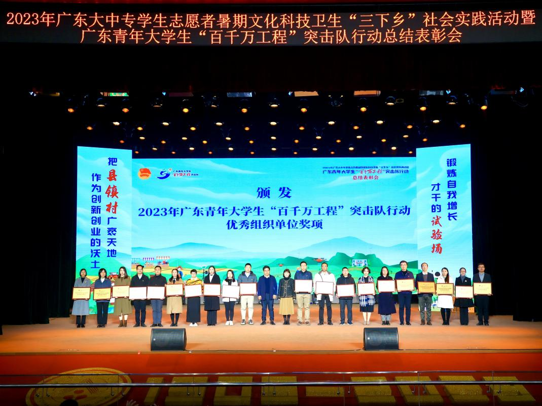 12月21日,2023年广东青年大学生“百千万工程”突击队行动总结表彰大会在华南农业大学举办,我校获评2023年广东青年大学生“百千万工程”突击队行动“优秀组织单位”。在今年的省级“三下乡”社会实践总结工作中,我校共获得14项荣誉,其中“净湖卫士——用激光雷达及人工智能技术守护东莞水域环境”等2个项目获“优秀品牌项目”称号(全省共100个)、“莞铜乡情连,多彩贵州行——东莞职业技术学院石阡实践团”等7个团队获“优秀团队”称号、杨泽坤等4名师生获“优秀个人”称号。
