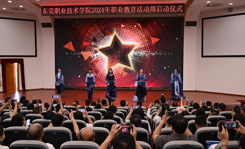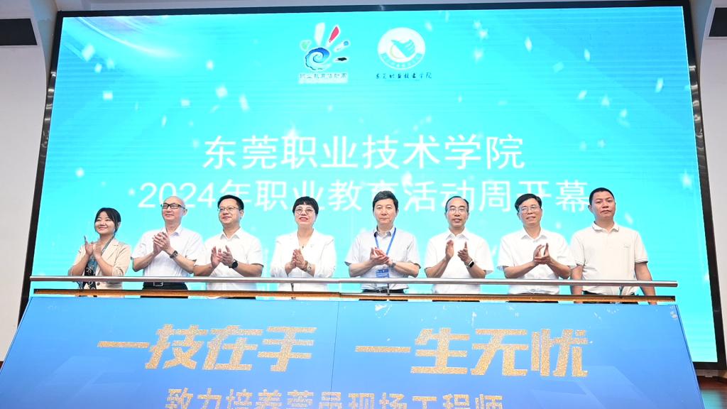 随后,我校党委书记司琪,党委副书记、校长贺定修,教育局副局长徐泽文、广东酒店管理职业技术学院校长徐刚、东莞理工学校书记巫云、虎彩集团院长易益、北京精雕集团经理陈永涛等领导共同登台启动东莞职业技术学院2024年职业教育活动周。