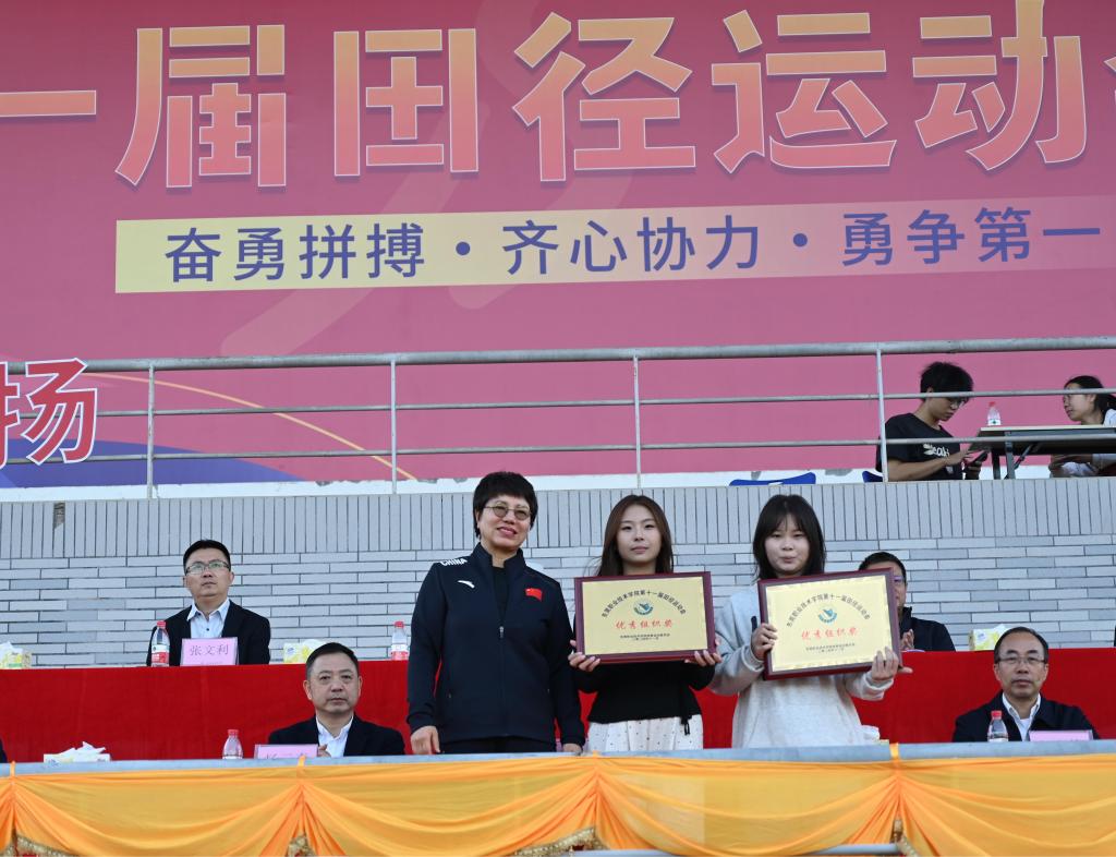 随后,校领导,各部门、学院相关负责人依次为获奖个人和集体颁奖。校党委书记司琪宣布东莞职业技术学院第十一届田径运动会闭幕。