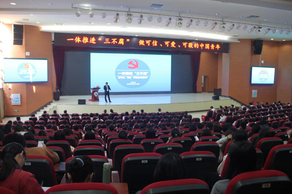 12月3日,学校党委副书记、纪委书记蔡东宝到卫生健康学院开展题为“一体推进‘三不腐’,做可信、可爱、可敬的中国青年”的主题党课,卫生健康学院教职工、学生党员及学生代表、物业经理、保安队长、食堂经理等近400人参加本次党课。