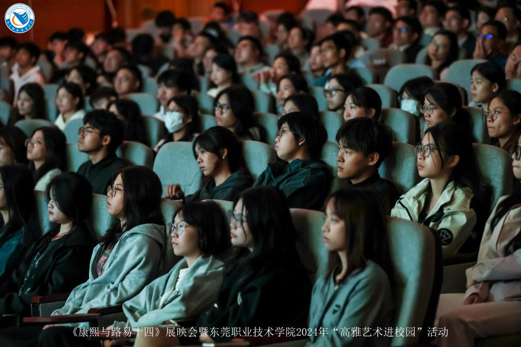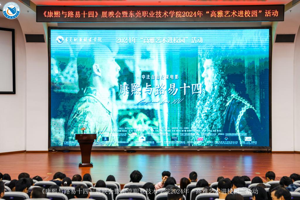 12月7日下午,《康熙与路易十四》展映会暨东莞职业技术学院2024年“高雅艺术进校园”活动在培训楼报告厅顺利举行。特邀嘉宾中山大学哲学系党委书记王丽霞;出品方领导嘉宾广州市广播电视台党委书记、台长陈家成,副台长徐斌;东莞市人大常委会副主任杨晓棠,香港城市大学(东莞)党支部书记赵毅,东莞市场监督管理局副局长林永强等市领导和相关单位代表出席活动,校党委书记司琪,校党委副书记、纪委书记蔡东宝参加活动,中山大学哲学系88级校友代表和中山大学哲学系东莞校友代表、学校师生代表共500余名观众共同观影。