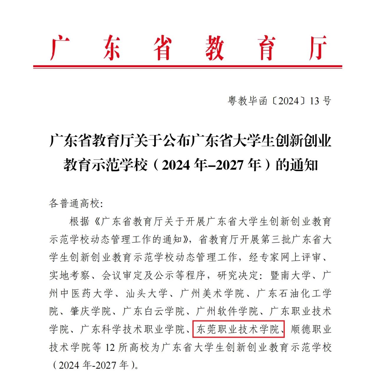 12月18日,省教育厅公布了第三批广东省大学生创新创业教育示范学校(2024年-2026年)名单,我校成功入选。此次入选为我校继获评广东省创新创业教育实践基地以来,在创新创业工作中荣获的又一项荣誉,是省教育厅对学校创新创业教育工作发挥示范引领作用的充分肯定。广东省大学生创新创业教育示范学校(简称“双创示范校”)每4年评选一轮,遴选工作由省教育厅组织专家组开展,评选流程包括高校申报、专家网评、实地考察、专家投票表决及公示等程序。
