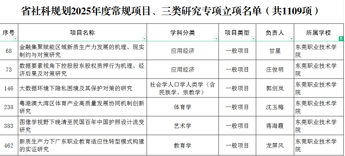近日,广东省哲学社会科学规划领导小组办公室发布《广东省哲学社会科学规划2025年度常规项目、三类研究专项立项名单》,我校甘星、庄俊明、郭剑岚、沈玉梅、蒋海霞、龙屏风等6位教师的项目喜获省哲学社会科学规划项目一般项目立项,立项数为上一年的两倍,在全省高职院校中排名第1位,创历史新高。