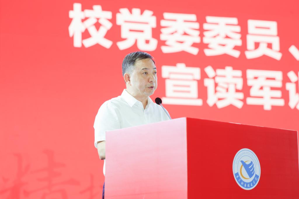 贺定修校长以《做可爱、可信、可贵、可为的新青年》为题发表讲话,他代表学校向4934名新生表示热烈欢迎,对承担军训任务的教官和老师们致以诚挚谢意,并特别为当天生日的两位同学送上暖心祝福。他指出,新时代大学生要传承抗战精神,践行校训文化,努力成长为新时代高技能人才。他强调,“在东职院,只要肯努力,人人都能出彩”,并围绕校训分享了四点感悟,一是崇德最可爱,崇德是立身处世的根本,同学们要明大德、守公德、严私德,以品德修养自我,以言行影响他人;二是笃行诚可信,知行合一,重在实践。同学们要脚踏实地,以坚实步履丈量成长之路;三是精技尤可贵。同学们需将技能锤炼至炉火纯青,沉心钻研、追求极致,以精湛技能为立身之本,成为真正的行家里手;四是创新大可为,创新是突破的核心动力。同学们要勇于尝试、不惧危险,在点滴探索中积蓄力量,终将迸发不凡光芒。