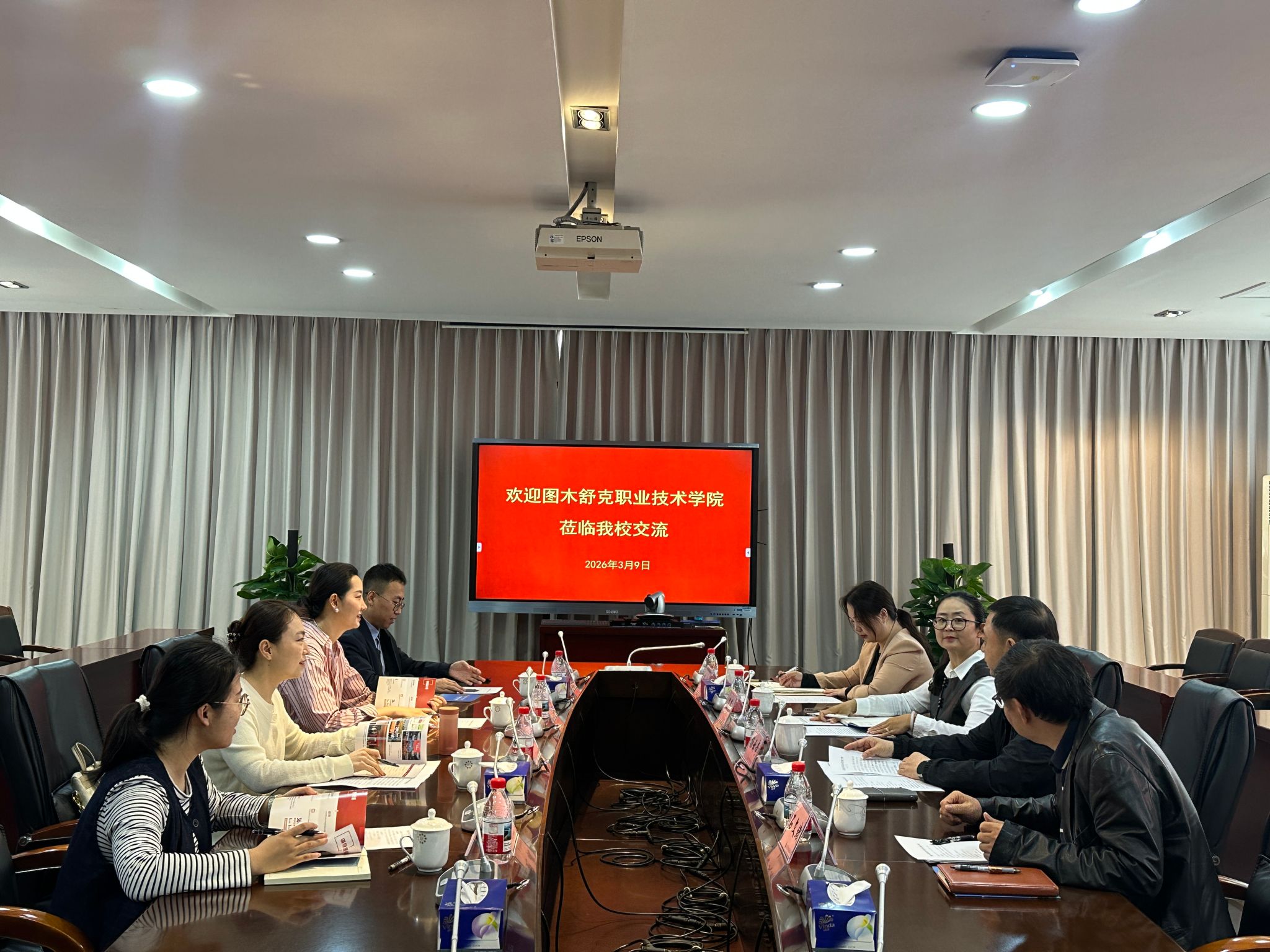 会上,杨云奇副院长对图木舒克职业技术学院一行的到来表示热烈欢迎,并简要介绍了我校的发展历程、办学特色及近年来在人才培养方面取得的成果。随后,双方围绕马克思主义学院建设、学生工作、共青团工作、校园文化建设等议题展开深入交流。马克思主义学院党总支书记石文斌分享了我校马克思主义学院在思政课教学改革、红色文化传承等方面的特色做法;学生处负责人范军介绍了我校“一站式”学生社区建设及学生管理服务的创新举措;团委负责人汤晓重点分享了我校第二课堂品牌打造及校园文化活动的组织经验。