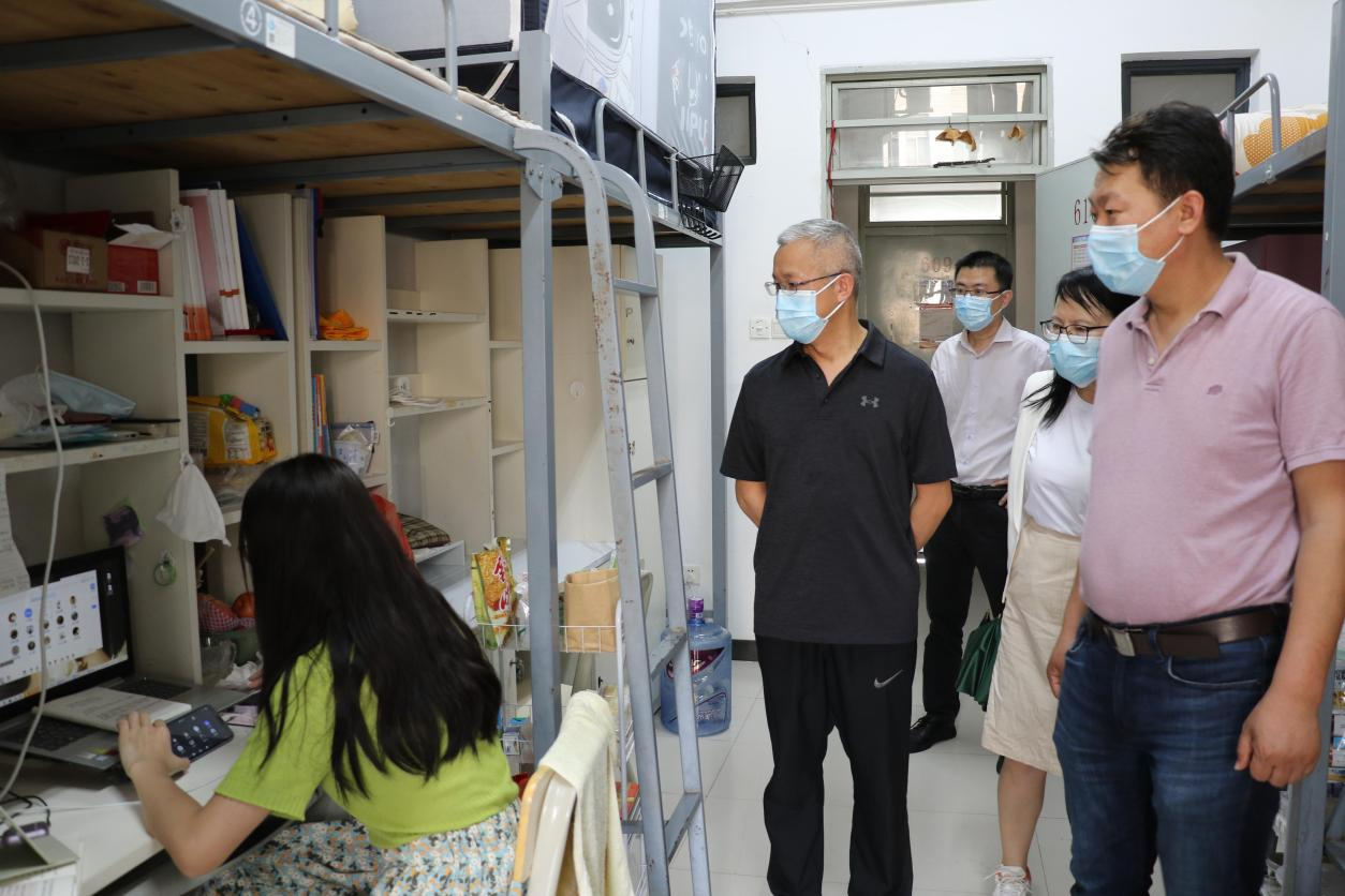 为更好了解经管学院留校学生的学习、生活和健康状况,切实解决疫情防控期间学生遇到的困难,3月15日下午,学校党委委员、教务处处长王志明教授、经管学院党总支书记陈柏林、院长周虹、副院长张文利、辅导员钟银贞老师一起走访学生宿舍。