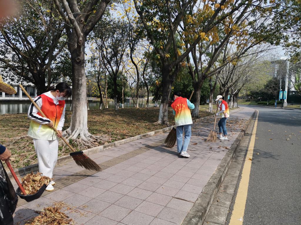 学生志愿者清扫落叶