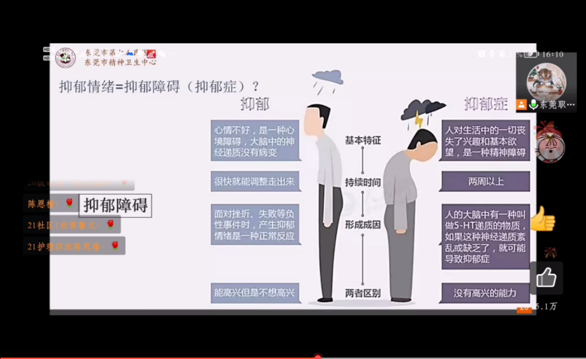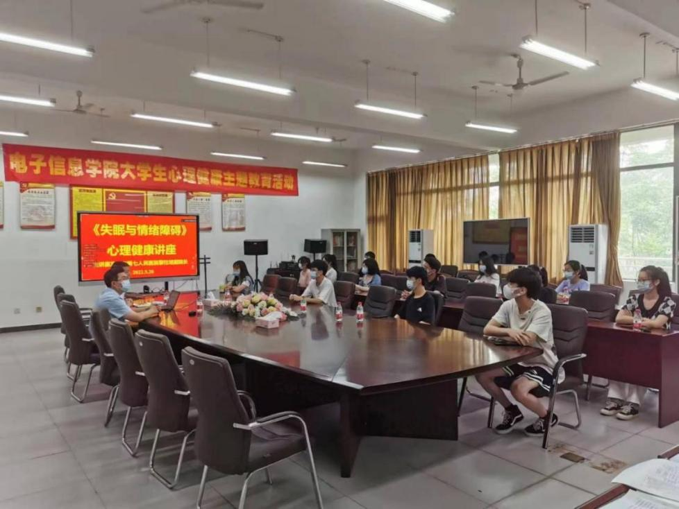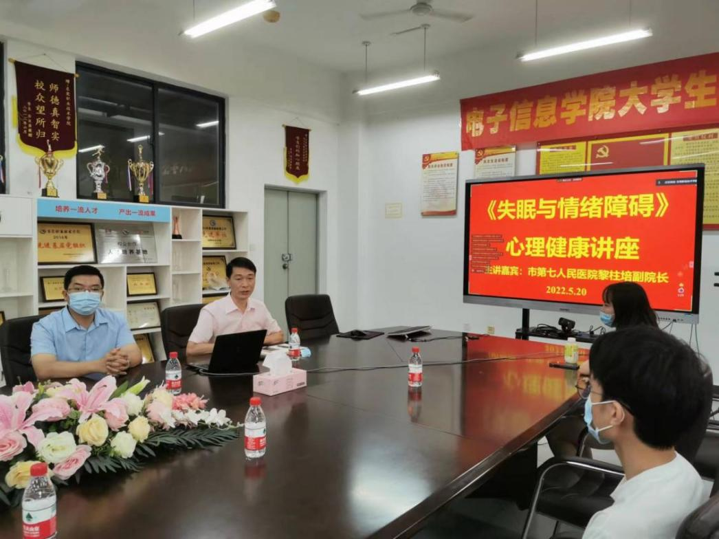 根据《东莞职业技术学院第十三届“5·25”大学生心理健康活动月工作方案》的通知精神,针对疫情以来同学们在学业、就业、环境变化、以及人际交往等方面容易引发的情绪障碍问题,为引导同学们正确面对和有效缓解压力,近日,我院在8A307会议室以线上线下相结合方式举办了《失眠与情绪障碍》心理健康主题讲座,讲座邀请到东莞市第七人民医院黎柱培副院长前来授课,据不完全统计,全校有近600名同学参与聆听,学生处李俊衡副处长和心康中心相关老师莅临现场指导并与专家交流。