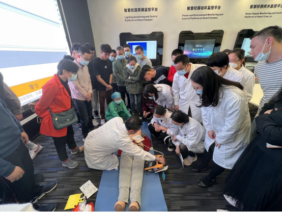 活动中,汤日祥主任还利用模型,对检查意识、胸外按压、人工呼吸、AED操作等环节进行示范性实操。教职员工们纷纷离开座位,围站在汤日祥主任身边近距离观看,不愿错过任何一个动作细节。