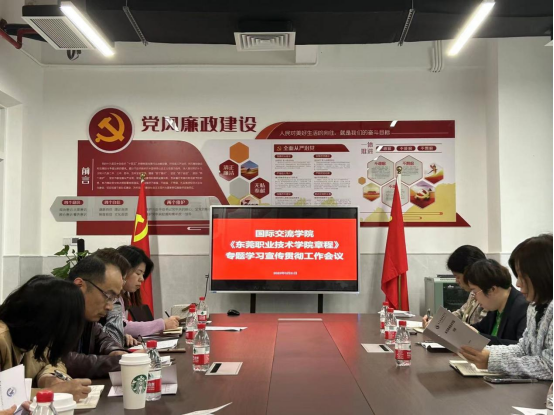 为做好《东莞职业技术学院章程》(以下简称《章程》)的学习宣传、贯彻实施工作,3月31日下午,国际交流学院在学院党建会议室开展《章程》学习宣传活动。党总支委员,第一、二党支部委员,工会委员,教研室主任及新进职工参加了活动。