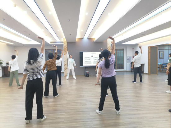 练习期间,杨彩如老师循循善诱、深入浅出阐述古代导引功法的历史缘由及功效原理,带领大家分段学习“八段锦”的全套动作,并详细解读动作要领。杨老师的讲解通俗易懂,动作示范标准柔美、行云流水,获一致好评。