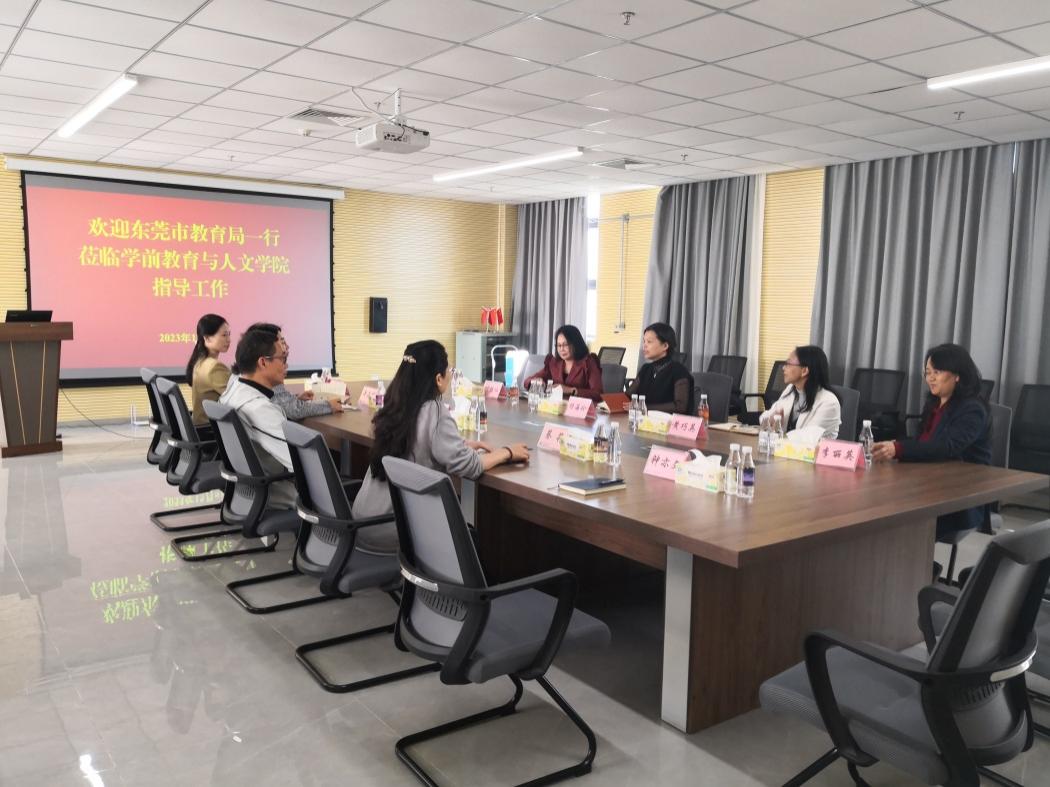 12月8日上午,东莞市教育局四级调研员杨海珍、学前教育科科长黄巧英、东莞市学前教育教研室李丽英副主任一行4人来我校学前教育与人文学院交流,学前教育与人文学院相关领导参加了本次交流会。