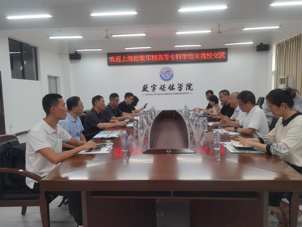 7月19日上午,上海出版印刷高等专科学校原党委副书记顾凯、科研处副处长宗利永一行来我校交流,我校党委委员、教务处处长王志明,产教融合办负责人、科研处副处长陈永刚,数字媒体学院院长李小东等人参加座谈。