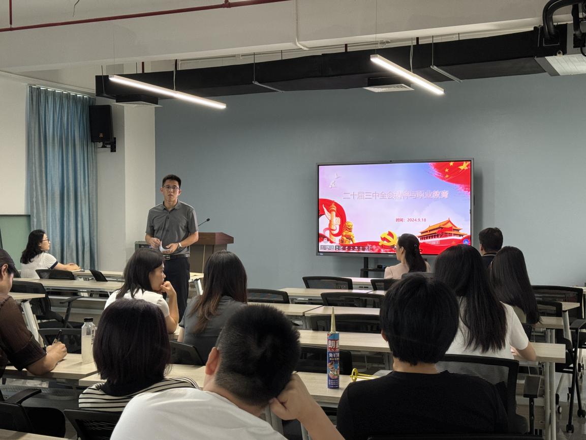 9 月 18 日下午,创意设计学院党总支书记、院长陈炯然带领全体教师开展学习贯彻党的二十届三中全会精神会议,深入解读会议精神并结合职业教育与学校实际提出学院发展策略。