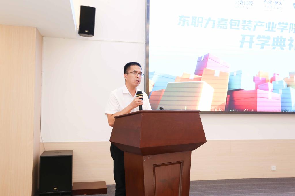 9月25日下午,东职力嘉包装产业学院开学典礼在力嘉环保包装印刷产业园行政楼大会议厅举行。我校产教融合办主任陈永刚,桥头镇人民政府党委委员林锦彪,力嘉国际集团董事长马伟武,东莞市出版业协会秘书长麦志强以及72名包装策划与设计专业学生等近百人出席。