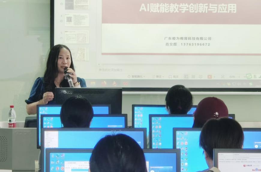 为全面提升全校师生人工智能素养及应用能力,推进人工智能技术与教学改革的深度融合,10月16日,教务处邀请了广东橙为教育科技有限公司来校数字化大楼8D401机房进行AI赋能教学创新与应用的专题培训。培训吸引了100余名教师参与。