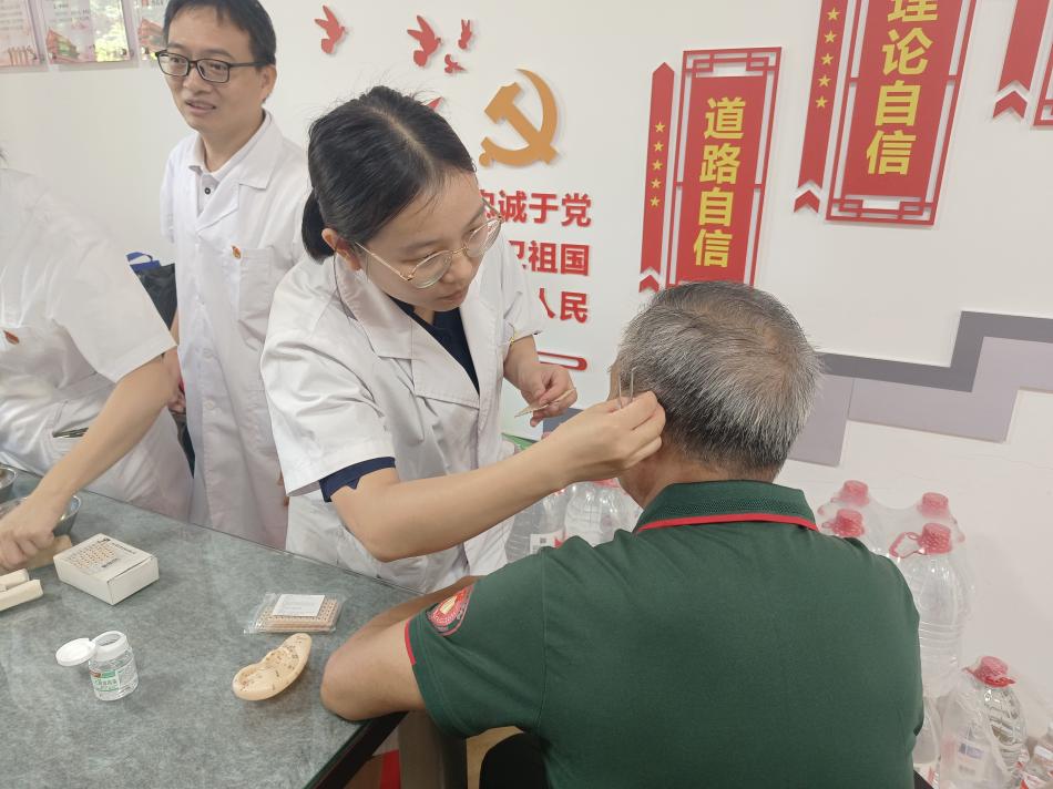 活动期间,我校卫生健康学院邓国金老师为该社区52名重点优抚对象主讲了题为“促进健康,怡享老年”的健康讲座,讲解老年人保健、康复疗养等方面的知识。另外,我校卫生健康学院党员老师们还为社区退役军人提供耳穴埋豆、健康咨询等义诊服务。