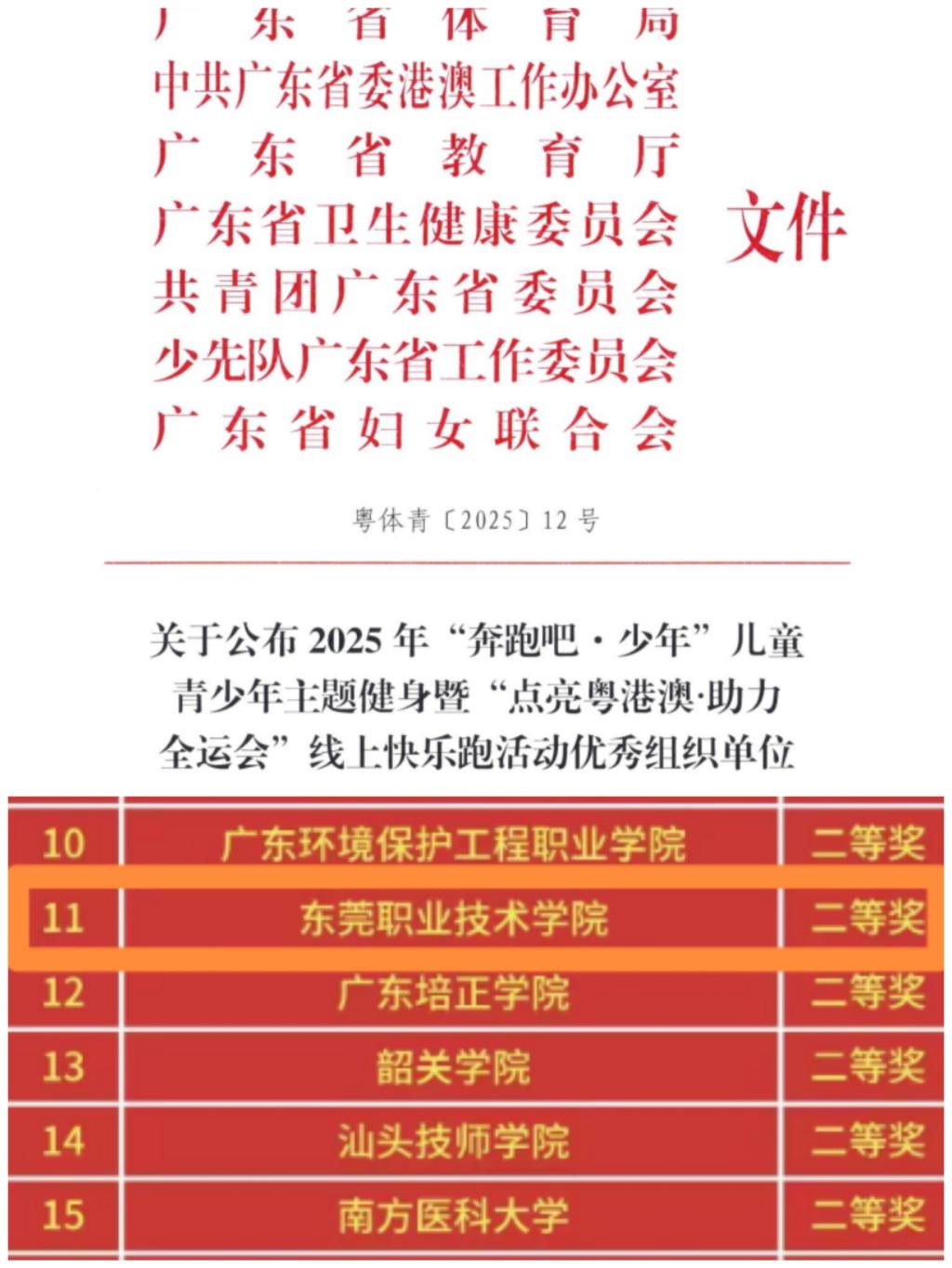 近日,广东省体育局、教育厅等联合主办的2025年“奔跑吧·少年”儿童青少年主题健身暨“点亮粤港澳·助力全运会”线上快乐跑活动落幕。我校凭借优异表现,以总成绩位列全省高等院校组第十一名,斩获二等奖及“优秀组织单位”称号。全校共10207名学生参与,其中510人荣获奖项,包括一等奖103人、二等奖30人、三等奖121人、优秀奖146人、参与奖110人,充分展现了学子积极进取的精神风貌。