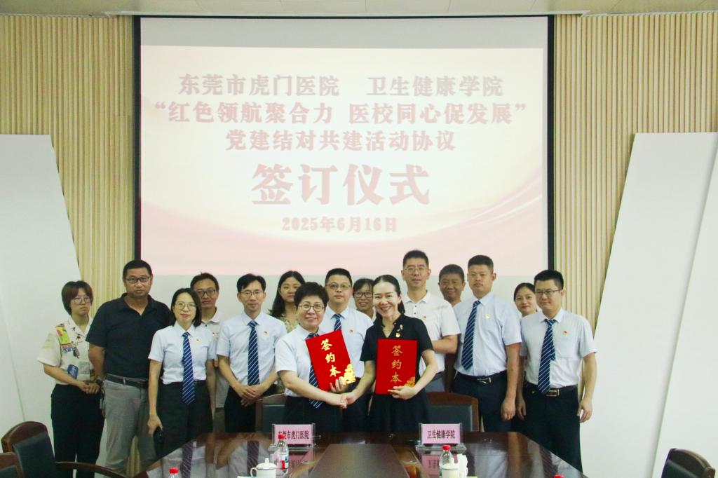 为强化党建引领作用,推动医教深度融合,6月16日上午,东莞市虎门医院党委与我校卫生健康学院党总支齐聚卫健院举行题为“红色领航聚合力 医校同心促发展”的党建结对共建活动协议签订仪式。卫健院党总支书记、院长宋海燕以及东莞市虎门医院党委书记杨伟琪等双方党组织领导、相关人员参加了此次活动,活动由卫健院党总支副书记王辰主持。