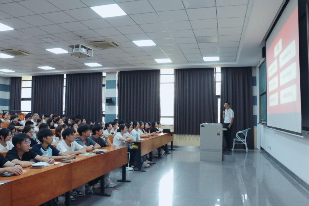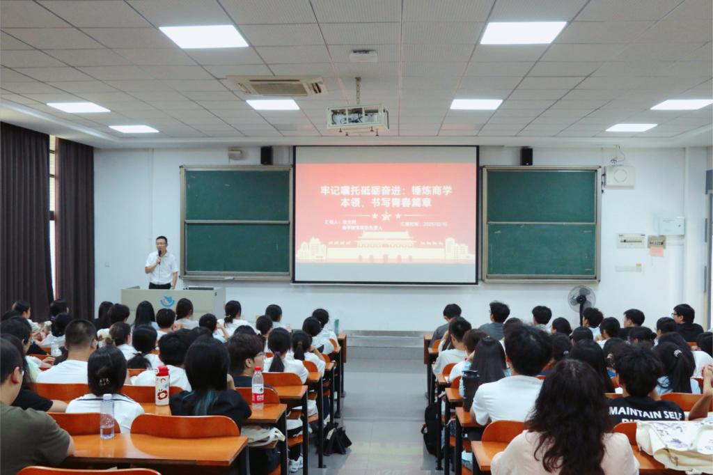10月10日下午,我校商学院(筹)党组织负责人张文利以“牢记嘱托砥砺奋进:锤炼商学本领,书写青春篇章”为主题,为25级物流协同一班与25级金融协同一班的全体同学带来了一堂思想深刻、内容翔实的思政第一课。