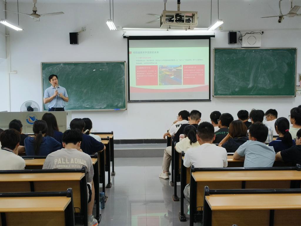 课上,卞建勇介绍了电子信息行业在国家发展中的重要战略地位,鼓励每一位未来“电子人”勇担责任,将个人理想与国家发展紧密结合起来,勉励同学们将“青春之我”融入“科技强国”的时代洪流。他还为同学们展示了电子信息学院优秀校友的风采,这些生动鲜活的榜样,为同学们树立了学习标杆,为同学们提供了未来成长借鉴。