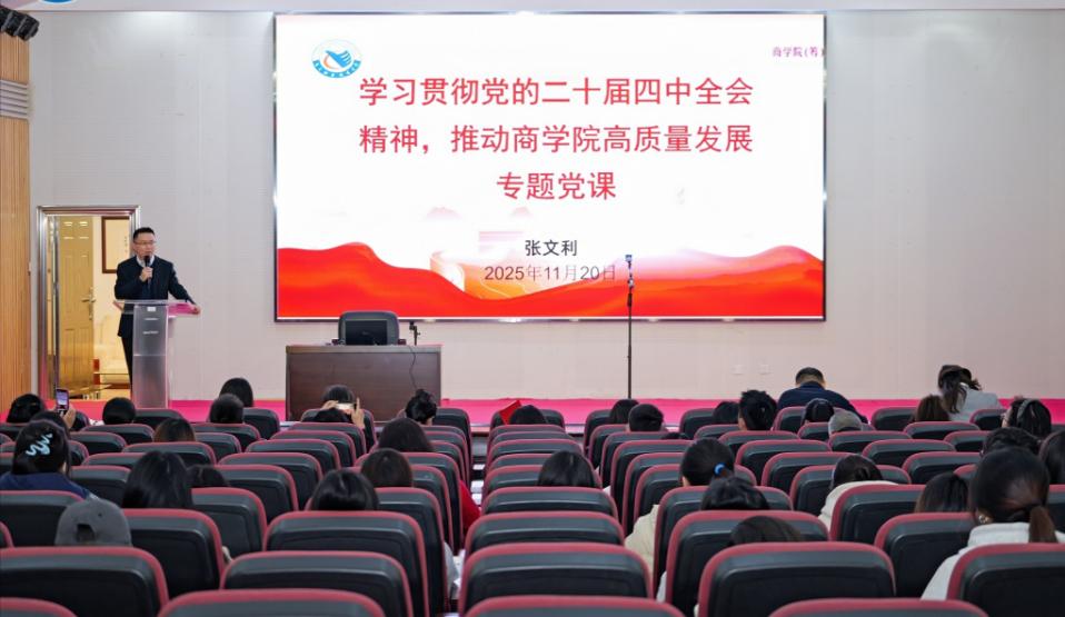为深入学习贯彻党的二十届四中全会精神,推动商学院(筹)高质量发展,11月20日下午,商学院(筹)党组织负责人张文利在图书馆学术报告厅讲授了“学习贯彻党的二十届四中全会精神,推动商学院高质量发展”专题党课。商学院(筹)学院全体教师、学生预备党员及入党积极分子参加了此次学习。