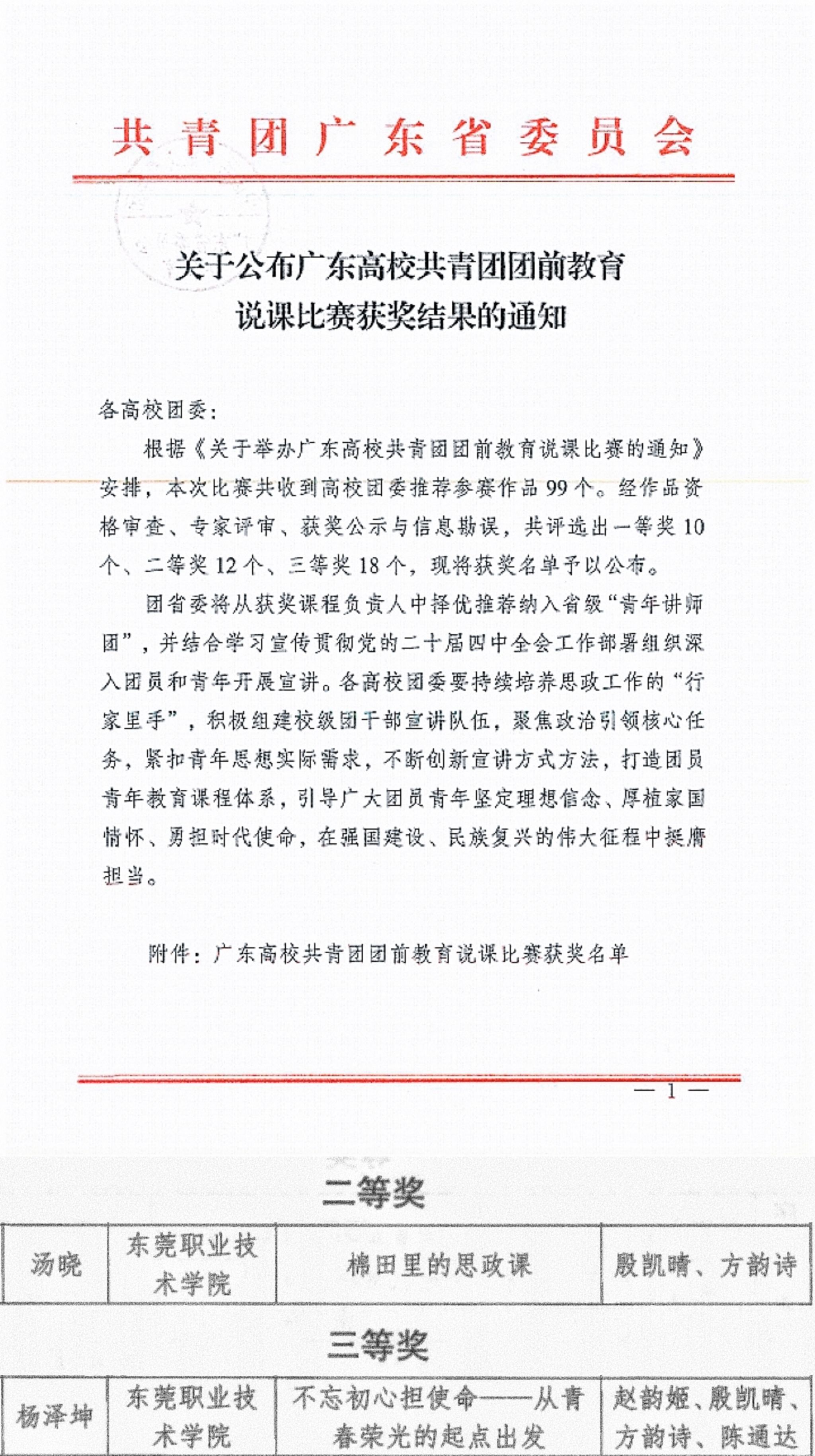 近日,广东高校共青团团前教育说课比赛决赛落幕。我校汤晓老师团队课程《棉田里的思政课》获二等奖,杨泽坤老师团队课程《不忘初心担使命——从青春荣光的起点出发》获三等奖。