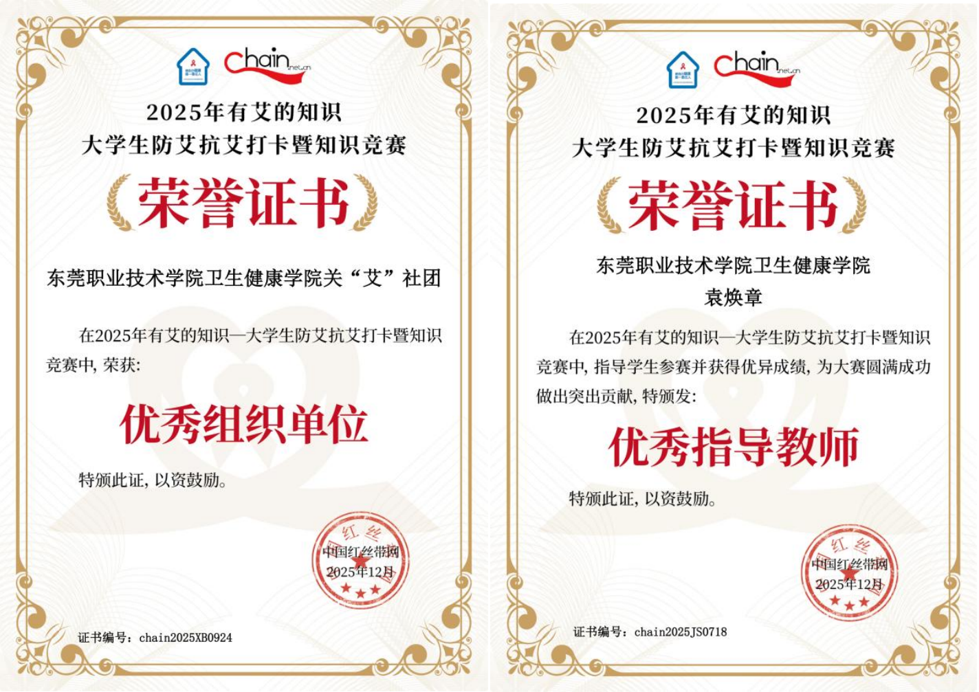 本次竞赛由中国红丝带网主办,以打卡学习与知识竞赛相结合的形式,面向全国大学生普及防艾抗艾知识。关“艾”社团在袁焕章老师的带领下,从活动宣传、人员动员到参赛筹备全程统筹推进,高效的组织工作获主办方认可。袁焕章老师深耕防艾科普教学,悉心指导学生备赛参赛,助力学生在竞赛中取得优异成绩。