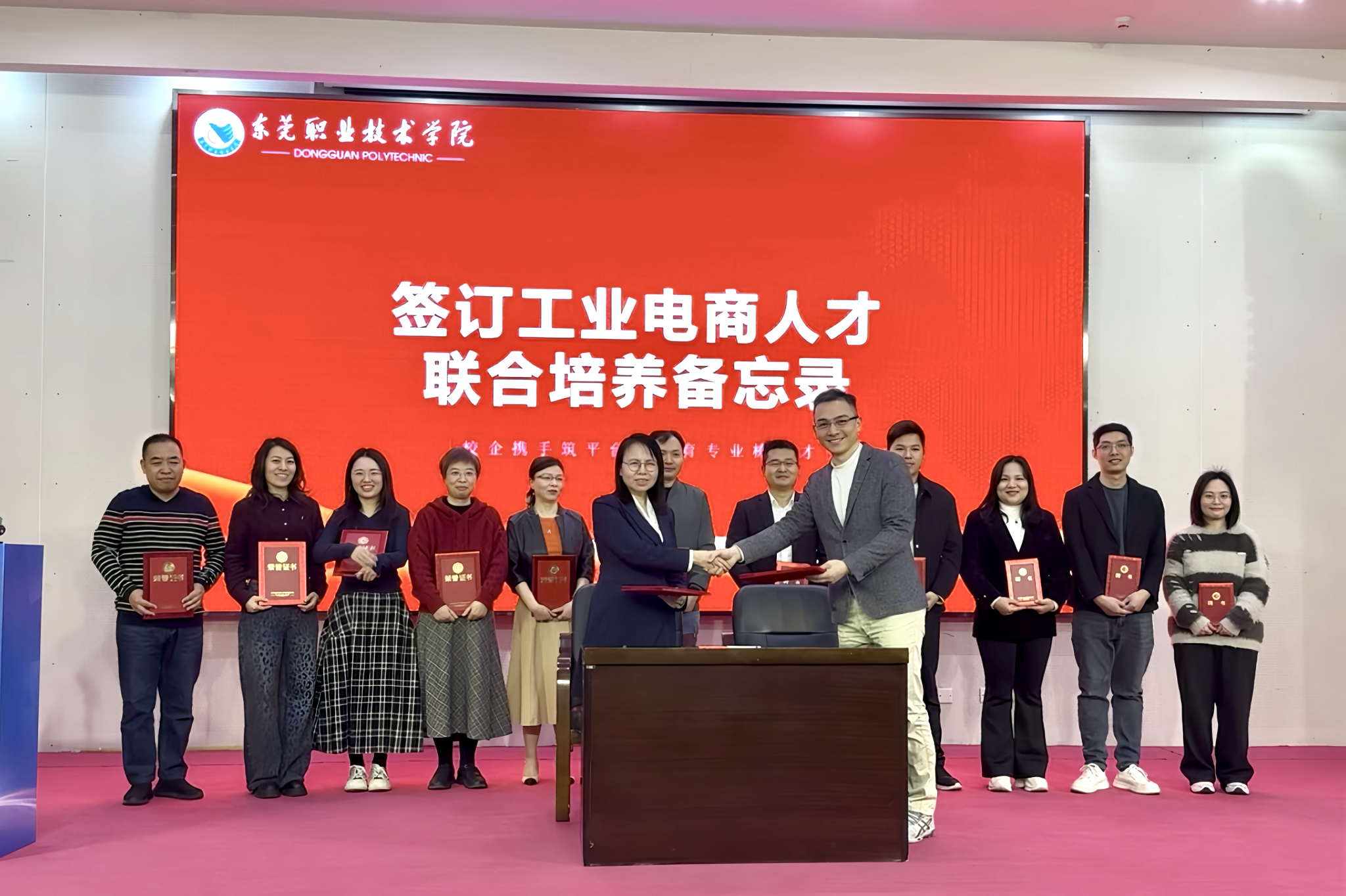 会上,商学院(筹)行政负责人周虹教授与广东中科鸿泰新材料有限公司副总裁马伟杰共同签署了《工业电商人才联合培养备忘录》,双方将在课程开发、教材编写、实践基地建设、师资互聘等方面展开深度合作,标志着校企协同育人迈上新台阶。随后,双方互颁聘书,并为实训中表现优异的同学颁发了荣誉证书。