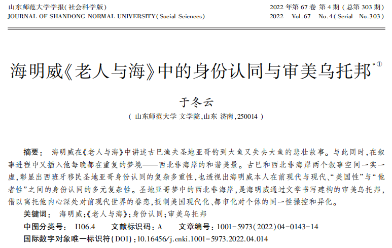 近日,我院于冬云教授的论文《海明威<老人与海>中的身份认同与审美乌托邦》刊发于《山东师范大学学报(社会科学版)》2022年第4期。