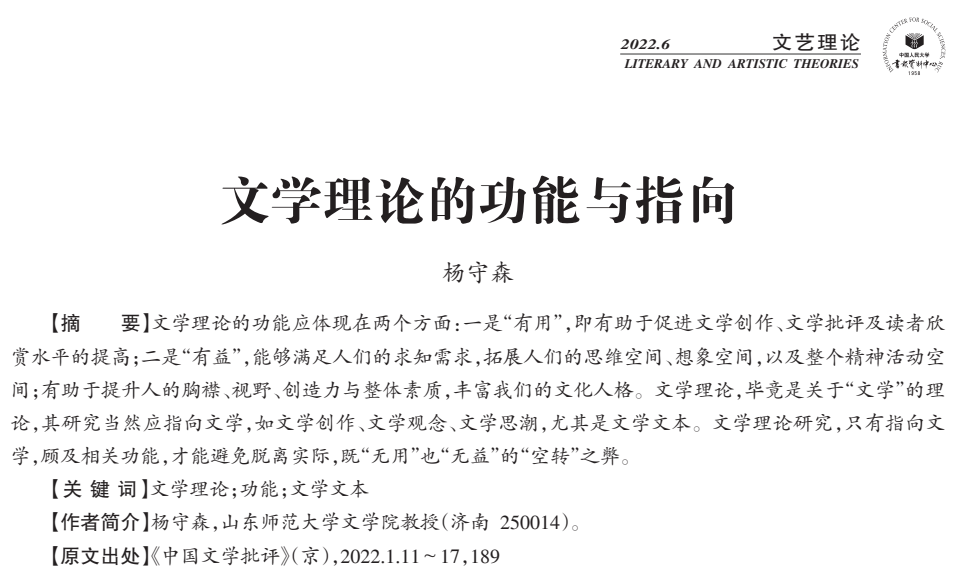 近日,文学院杨守森教授的论文《文学理论的功能与指向》被《中国人民大学复印报刊资料·文艺理论》2022年第6期全文转载。该文原刊于《中国文学批评》2022年第1期。
