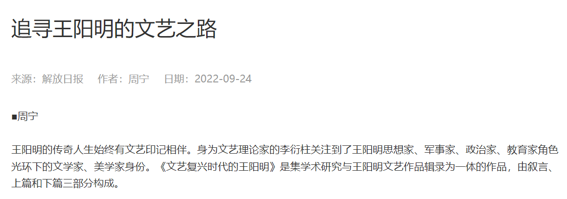 文章指出,王阳明的传奇人生始终有文艺印记相伴。身为文艺理论家的李衍柱关注到了王阳明思想家、军事家、政治家、教育家角色光环下的文学家、美学家身份。《文艺复兴时代的王阳明》是集学术研究与王阳明文艺作品辑录为一体的作品,由叙言、上篇和下篇三部分构成。