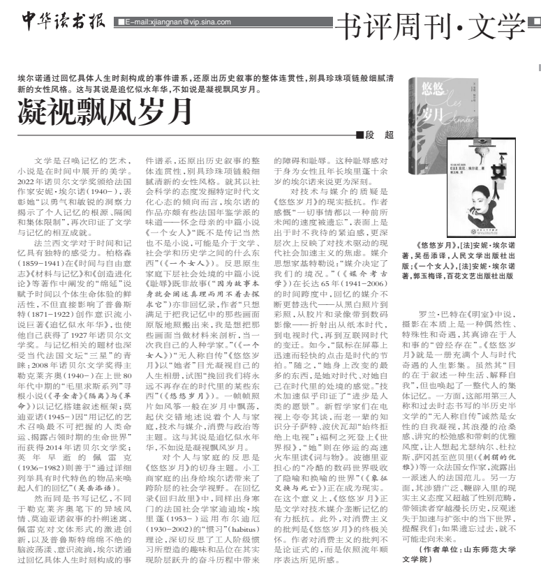 近日,我院段超老师的书评《安妮·埃尔诺:凝视飘风岁月》刊发于《中华读书报》2022年10月19日第11期。