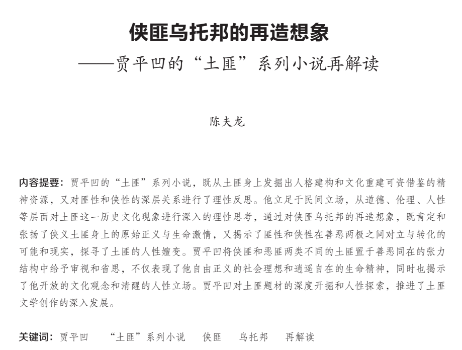 近日,我院陈夫龙教授的论文《侠匪乌托邦的再造想象——贾平凹的“土匪”系列小说再解读》刊发于《中国当代文学研究》2022年第6期。