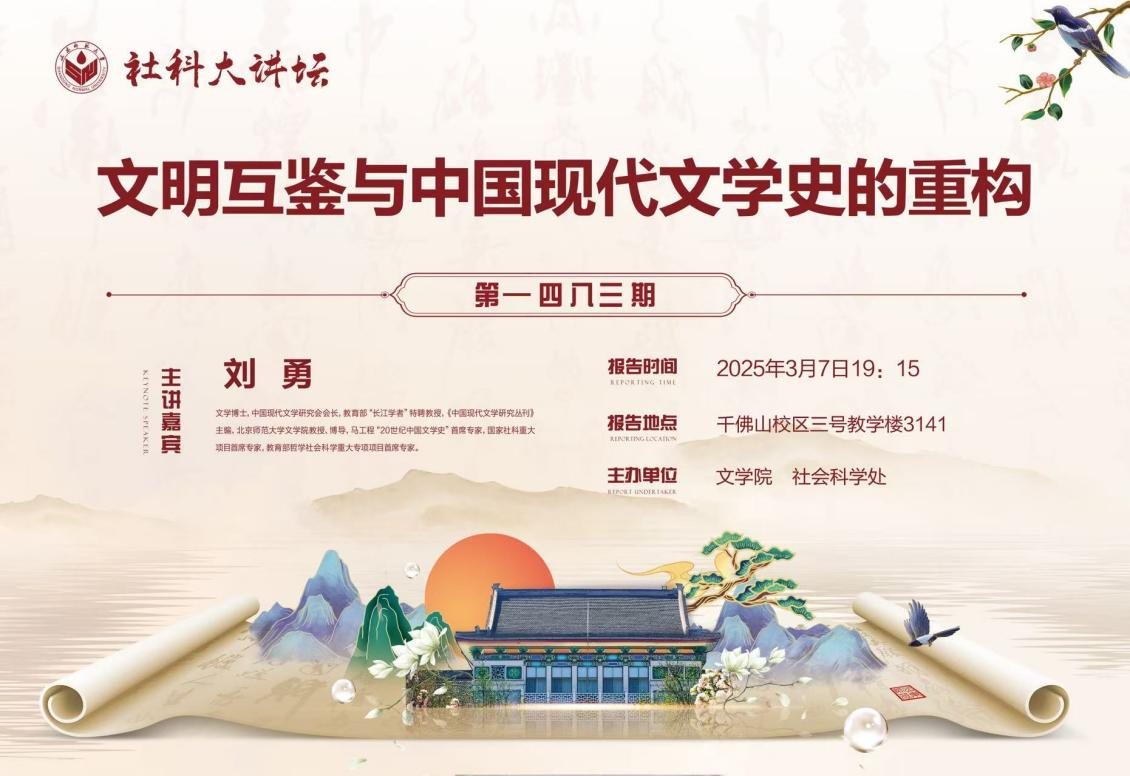 2025年3月7日,北京师范大学文学院刘勇教授受邀作客山东师范大学社科大讲坛,于千佛山校区教学三楼3141做了关于“文明互鉴与中国现代文学史的重构”的学术报告。讲座由文学院魏建教授主持,院长孙书文、李宗刚教授、孙桂荣教授等文学院师生40余人参加了本次活动。