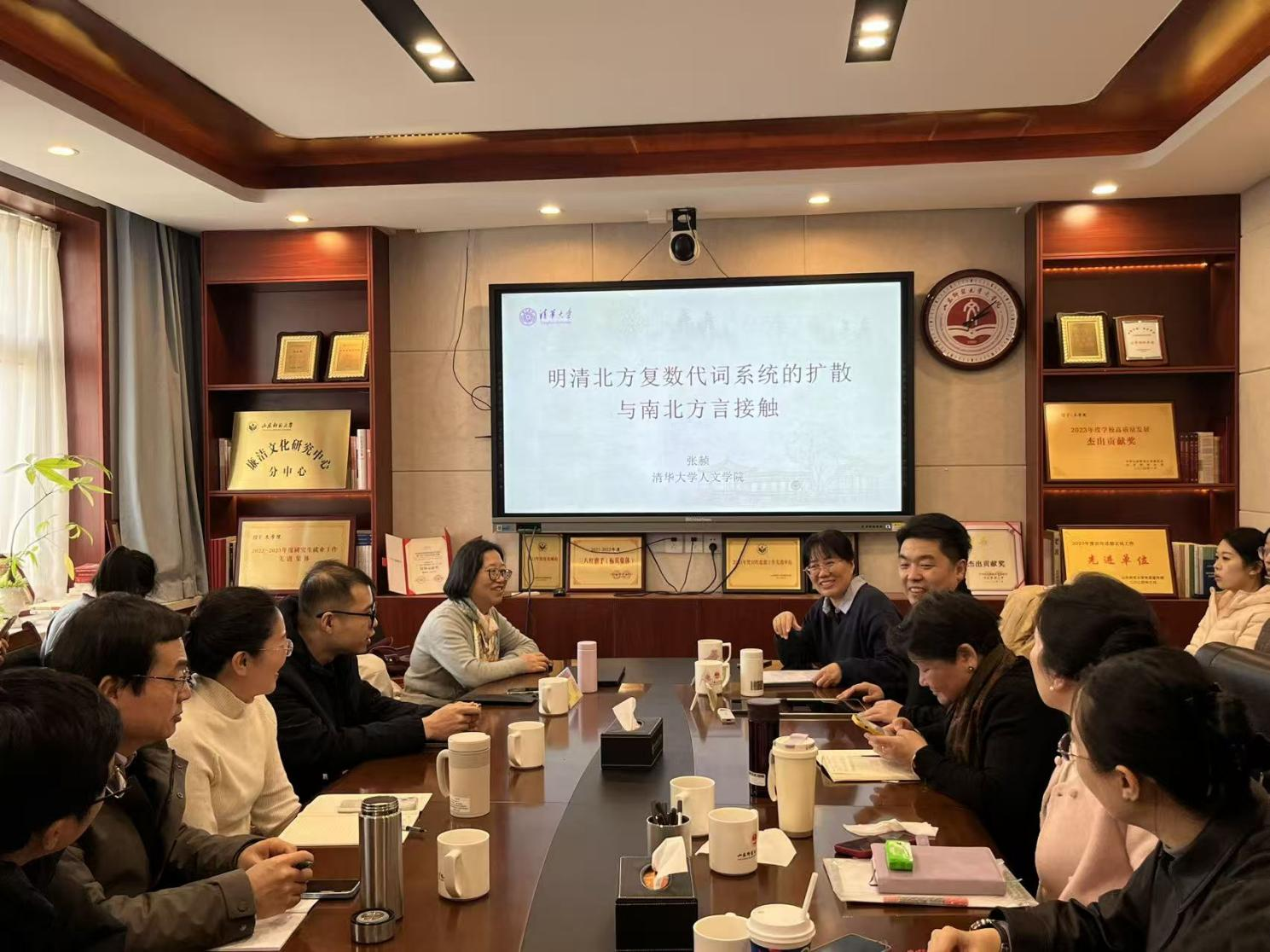 2025年12月24日下午,清华大学人文学院中文系长聘教授,《清华语言学》主编张赪教授应邀来到山东师范大学文学院,为师生带来题为“明清北方复数代词系统的扩散与南北方言接触”的学术报告。山东师范大学文学院教授张俊阁主持会议,李建平教授致欢迎词,古代汉语教研室、现代汉语教研室及古籍整理研究所的邵燕梅、王红娟、王天佑、亓文婧、冯红梅、杨朋飞、王栋、张鑫、闫潇、孙兴金、李丹诸位老师及硕博研究生等共30余人参加了本次活动。