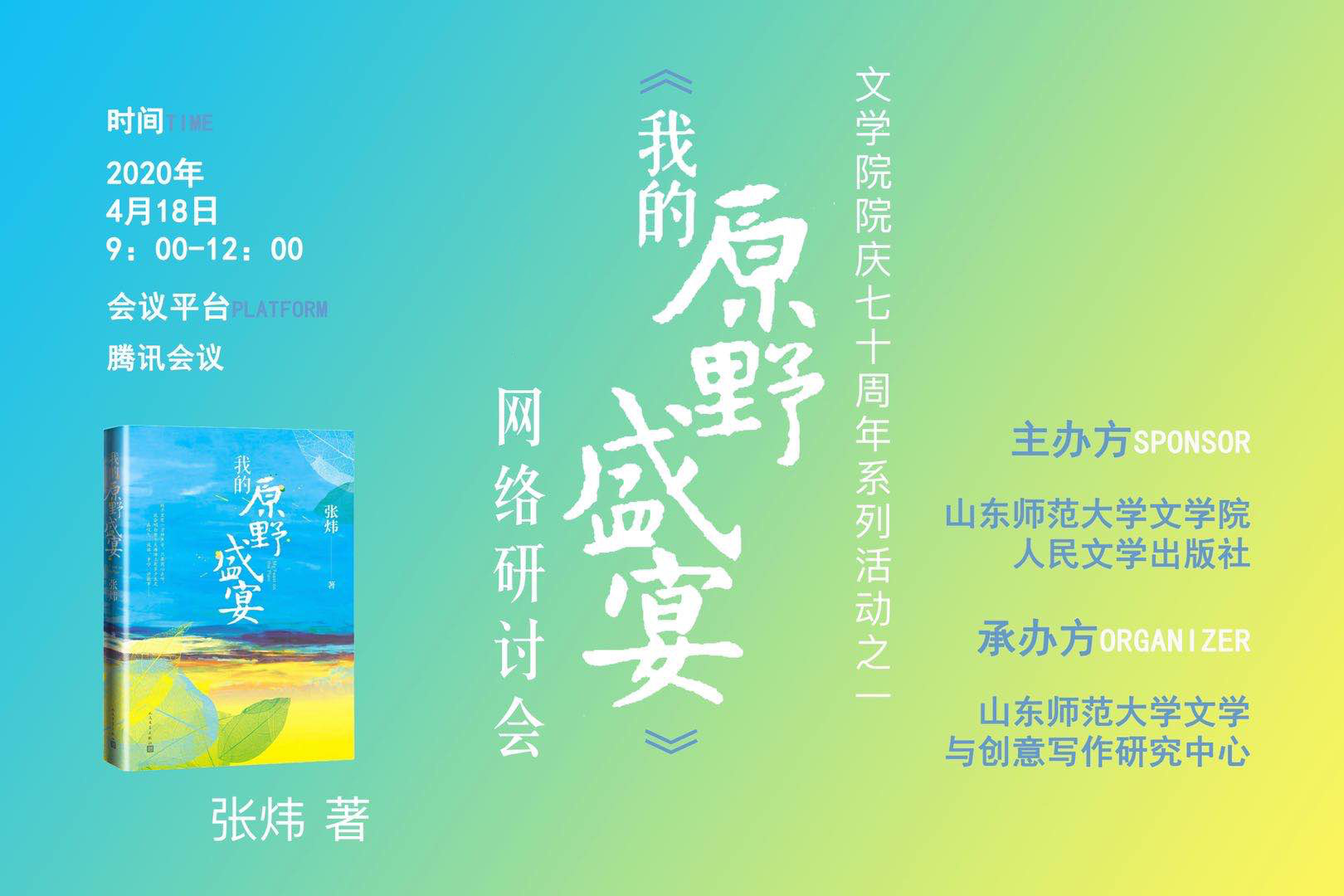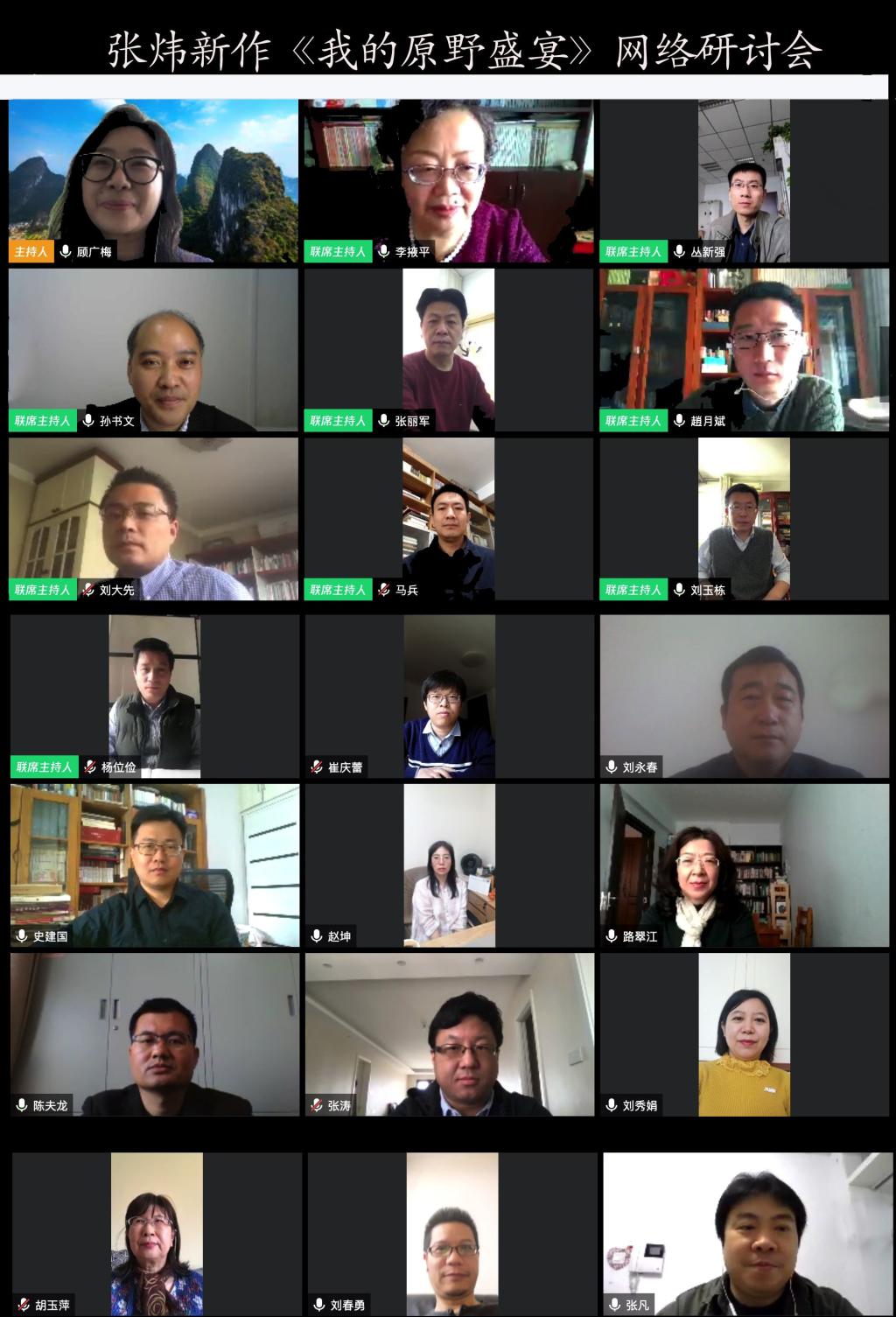4月18日上午9时,著名作家张炜长篇新作《我的原野盛宴》网络研讨会在腾讯会议如期举行。研讨会由山东师范大学文学院、人民文学出版社主办,山东师范大学文学与创意写作研究中心承办。来自中国作协、山东省作协、中国社会科学院、中国传媒大学、上海大学、山东大学、石河子大学、鲁东大学等各大高校和研究机构的二十余位知名作家、青年批评家在网络云端共同打造了一场别开生面、思想交锋的研讨盛会。