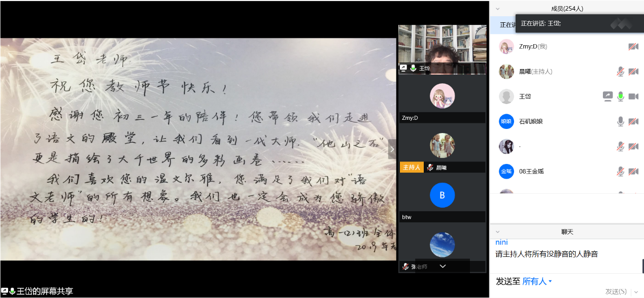 当谈及“在教学研究中成长”时,王岱老师突出了语文教师独立研究文本、在研究中尝试、在关注课程中充实的必要性和重要性,列举了自己参与教改的种种研究与尝试。她强调,独立研读文本的能力对于一名语文教师而言必不可缺,从学校走到教学一线后应当在课堂教学中日益提升、在教学研究中不断成长,切不可放弃自己进行学术研究的习惯,从而导致业务根基退化。秉持着思想无禁区、读书无限制、写作无模式的语文教育“三无”政策,王岱老师所采取的编辑《时文选读》、尝试专题教学与整本书阅读教学、举办读书节等教改措施,已取得卓越成效。针对“在感念学生中释然”,王岱老师重新回归到“保留赤子之心”的主题。她向同学们展示了一张写有“您满足了我们对‘语文老师’的所有想象”的教师节卡片,抒发了自己从教近三十年来从学生那里所获得的幸福感,并指出,学生的理解和认可足以使工作中的无奈和压力释然,从事教师职业要始终葆有一颗赤子之心,少一点功利色彩,关注自己喜欢的事情,投入热情去做并无怨无悔。最后,王岱老师以梅贻琦先生所言勉励同学们“赤子之心必须保留,凡是能做的和应当做的,好好去做就行了”,以“教师的精神空间有多大决定了教育的空间有多大,教师的品味决定了教育的品味”激励同学们做“一点一滴的努力、一点一滴的尝试、一点一滴的变革”,并期待每位同学都能成为更好的自己。
