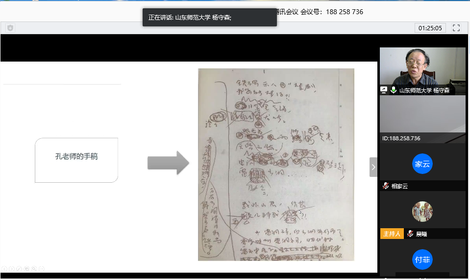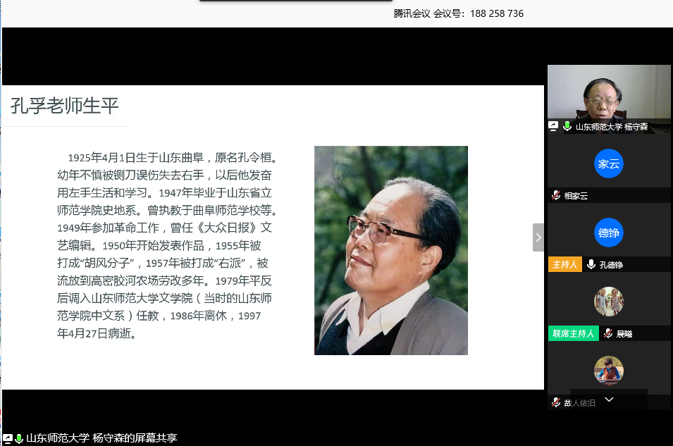 4月30日下午三点,山东师范大学文学院博士生导师杨守森教授应邀作文学院庆祝建院70周年系列讲座,本次讲座主题为“孔孚老师和他的诗歌创作”。讲座由文学院副院长李建平教授主持,文学院一百余名师生于线上聆听。